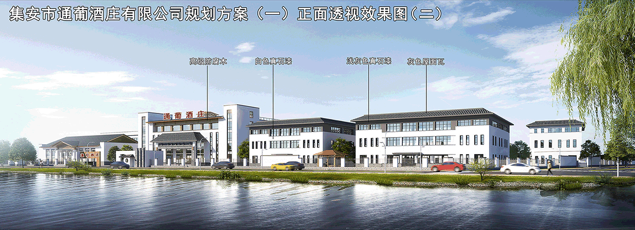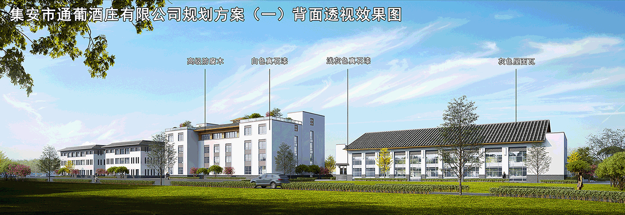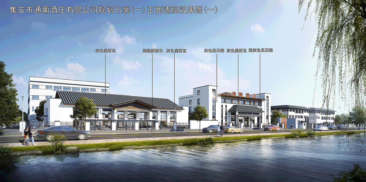 规划用地位于集安市,东至规划沿江路,南至田地,西至田地,北至规划酒庄路规划用地33334平方米。本方案设计理念在立面风格的设计上力求体现传统的简约微派风格,以现代建筑设计手法为主,同时融入提炼后的传统建筑手法精髓,采取传统酒庄手法,取得丰富的立面造型及立面效果。在色彩处理上以传统的微派风格的为主,墙以白色为主,门宙以深色搭配,屋顶为灰黑色坡屋面。在总体布局上建筑充分考虑地形的因素,建筑前后错落成丰富的视觉景观。